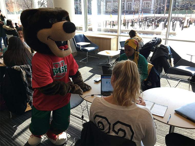 The Washington University Bear greets students at the grand reopening of Whispers Cafe in Olin Library Jan. 16. (Photo by Rob Staggenborg)