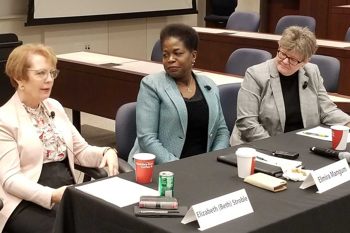 About 40 members of the university’s Association of Women Faculty and the Academic Women’s Network gathered Jan. 19 at the Knight Executive Education Center for a panel discussion on “Women and the University Presidency.” Tonya Edmond (right), of the Brown School, oversaw the discussion with panelists Beth Stroble (left), president of Webster University, and Elmira Mangum, former president of Florida A&M University. (Photo: Gail Boker)
