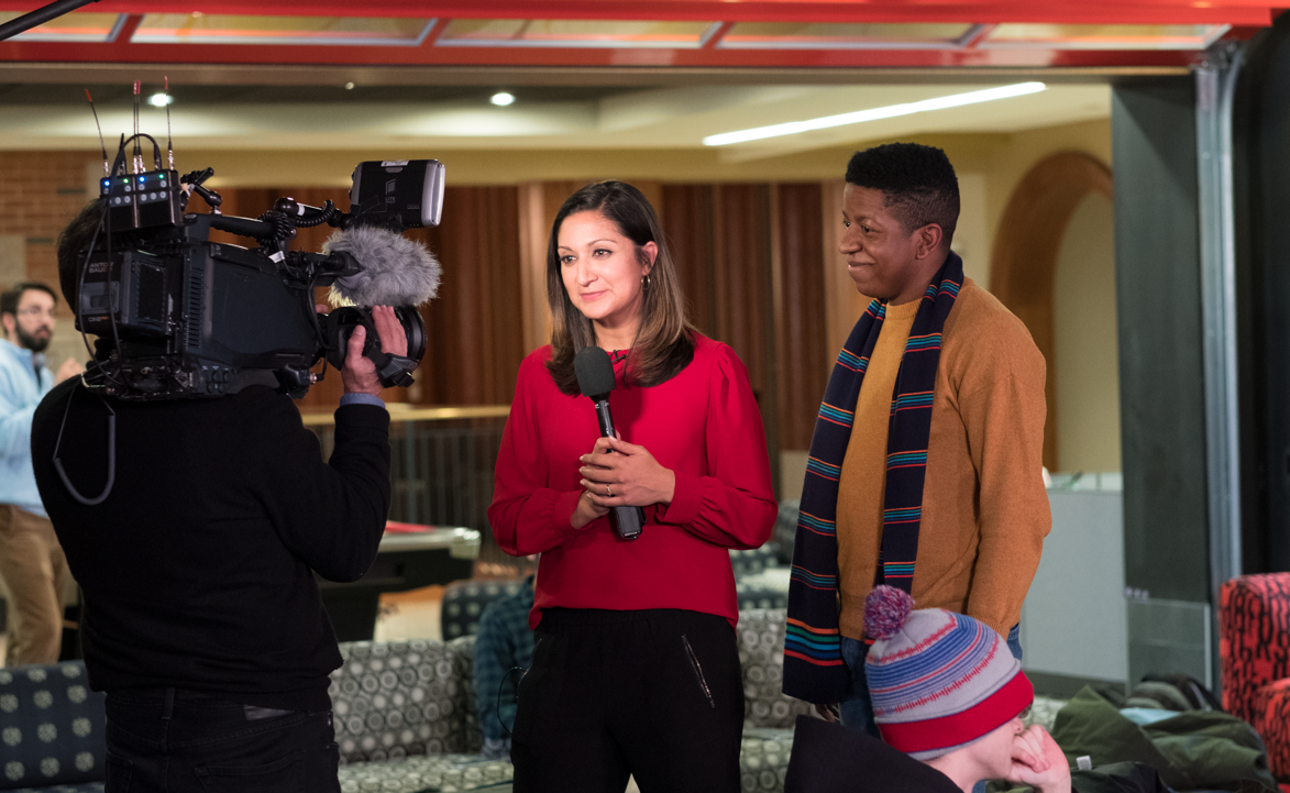 ABC News journalist Amna Nawaz (left) interviews junior Clayton Covington at the Danforth University Center before the State of the Union address Jan. 30. The ABC News crew was on campus to hear from students watching the president’s speech. (Photo: Whitney Curtis/Washington University)