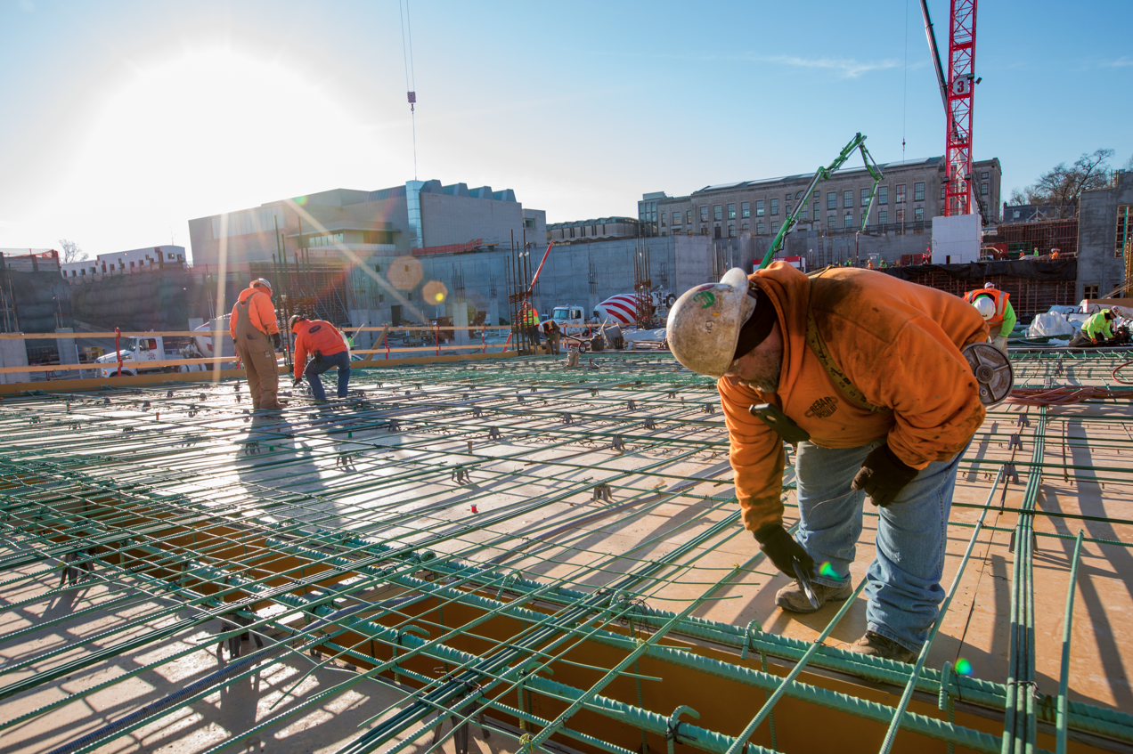 Construction workers began final preparation of the parking garage deck Jan. 19 before the start of pouring concrete on the east end construction site. (Photo: Joe Angeles/Washington University)