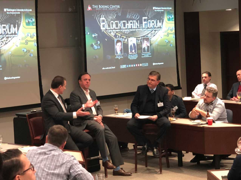 A panel discussion on Blockchain and its role in emerging financial technologies was held Jan. 18 in the Knight Executive Education Center at Olin Business School. Participants included Ed Corno, chief technology leader at IBM, David Andolfatto, vice president of the Federal Reserve Bank of St. Louis, and moderator Panos Kouvelis, director of Olin’s Boeing Center for Supply Chain Innovation. (Photo: The Boeing Center)