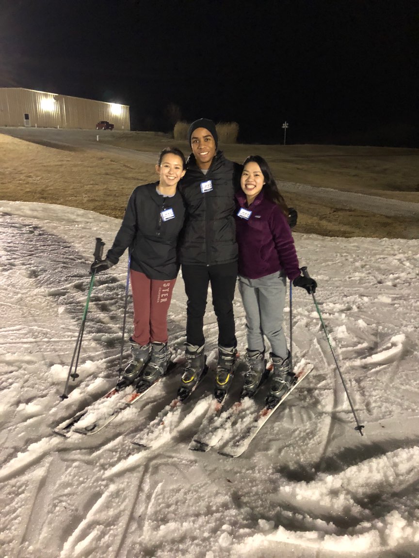 Students Sandra Suarez (left), Miles Charles and Courtney Chan hit the slopes at Hidden Valley. The night skiing and tubing trip was part of WashU Rec’s Bear Adventures series.