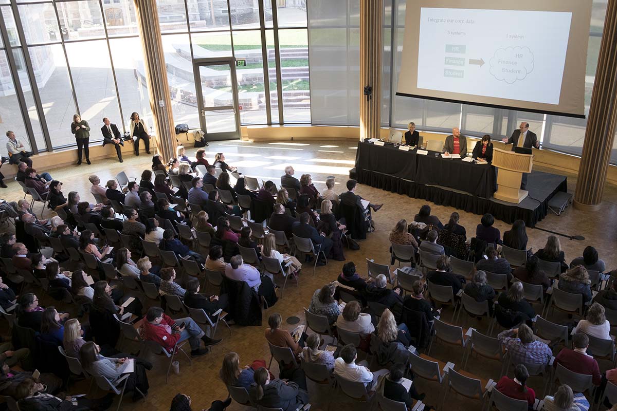 University staff members gathered March 13 in Hillman Hall’s Clark-Fox Forum for the Danforth Staff Council (DSC) spring town hall meeting. A crowd of about 350 staff heard updates on the chancellor’s search, human resources and other topics. Here, Henry Webber, executive vice chancellor for administration, discusses the MyDay project, a yearslong effort to replace and integrate the finance, human resources and student information systems. DSC Chair Betha Whitlow is to his right. (Photo: Sid Hastings/Washington University)