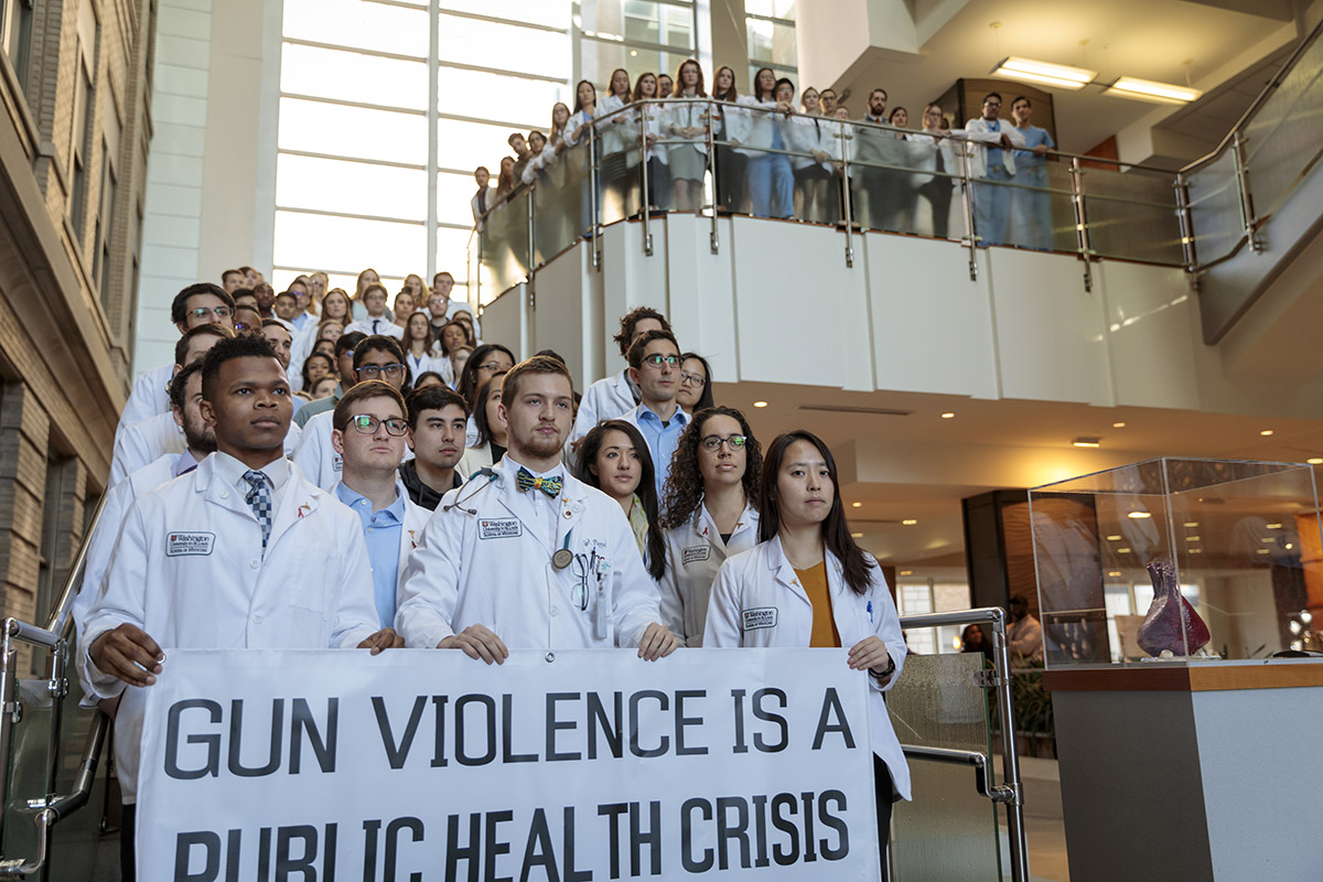Medical students gathered on the Medical Campus March 14, the day of nationwide protests against gun violence. Among their messages was support for Centers for Disease Control and Prevention funding to study gun violence as a public health issue. (Photo: Matt Miller/School of Medicine)