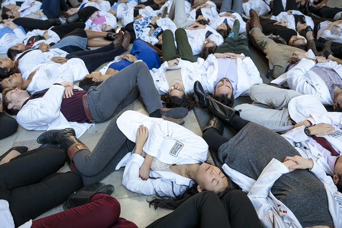 Several medical students participated in a “die-in” March 14 on the Medical Campus, the day of nationwide student protests against gun violence. (Photo: Matt Miller/School of Medicine)