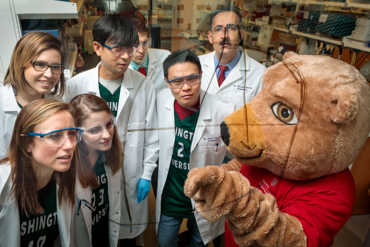 Farshid Guilak, professor of orthopedic surgery at the School of Medicine, and his lab plot March Madness strategy with the WashU Bear. Guilak’s team is competing in STAT Madness 2018, the March Madness of biomedical science. To vote for his team, vote for WashUMed in the STAT news bracket. (Photo: Matt Miller/Washington University)