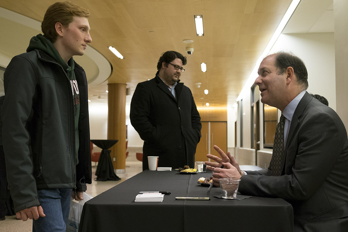 Ken Stern (right), former CEO of National Public Radio, chats with first-year student Henry Roseman March 6 in Knight Hall. Stern, who is also author of the book “Republican Like Me: How I Left the Liberal Bubble and Learned to Love the Right,” took part in a discussion on “Religion and Politics in an Age of Fracture.” (Photo: Sid Hastings/Washington University)