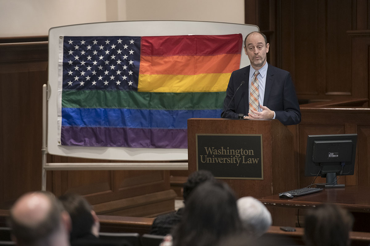 James Esseks, director of the ACLU’s Lesbian, Gay, Bisexual, Transgender & HIV Project, gives a keynote address, co-sponsored by the Assembly Series, at the Midwest LGBTQ Rights Conference on March 1 in Anheuser-Busch Hall. (Photo: Mary Butkus/Washington University)