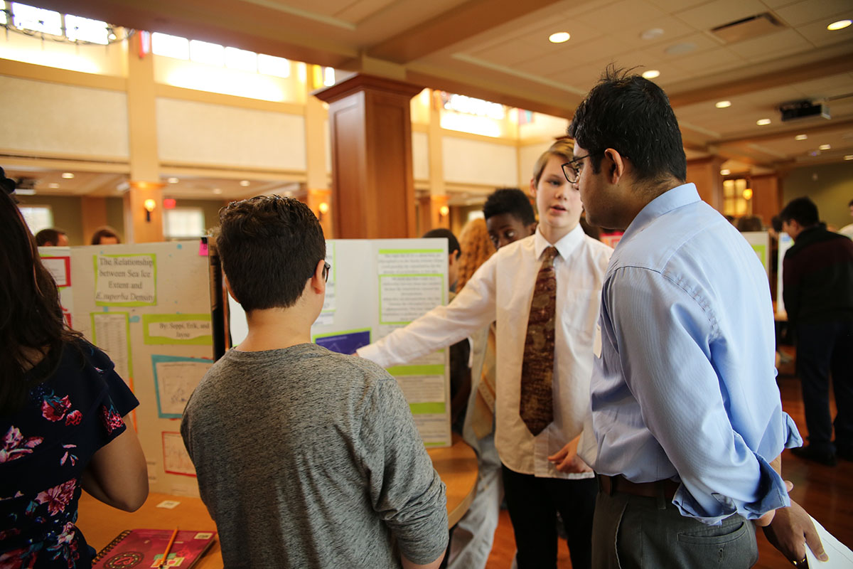 Rajan Chakrabarty, of the School of Engineering & Applied Science, talks with students from Maplewood-Richmond Heights during the Polar-ICE Sci-I Project Student Symposium held March 1 in College Hall. The students created science projects using actual polar ice data. The program was a collaboration between the Institute for School Partnership and Rutgers University. (Photo: Myra Lopez)