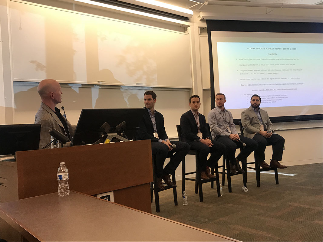 Patrick Rishe (left), director of Olin Business School’s Sports Business Program, moderates a panel at Stanford University as part of Stanford’s annual Sports Innovation Conference. Also on the panel are (from left) Fabian Stechel, of Evolution Media, Ari Segal, of Immortals, Kirk Lacob, of the Golden State Warriors, and Justin Dellario, of Twitch. (Photo courtesy of Patrick Rishe)