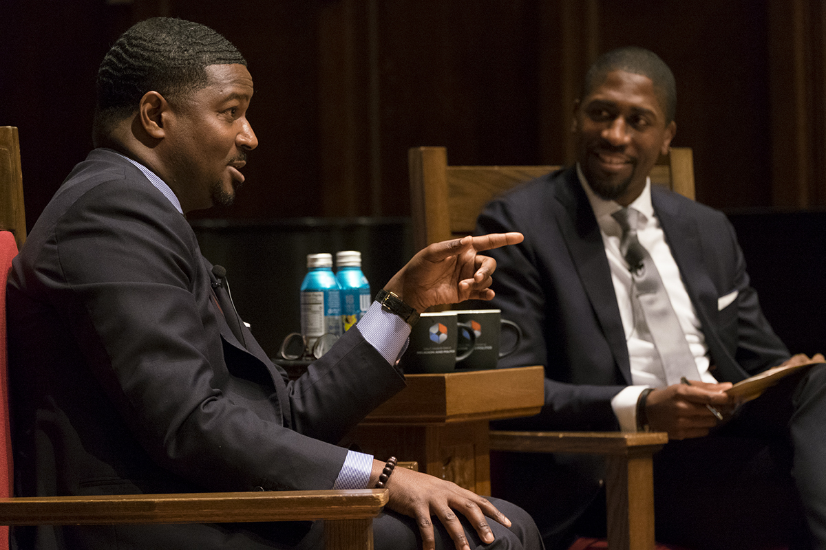 Jonathan Walton (left), of Harvard University, delivered a lecture on “Embracing King’s Political Philosophy of ‘Somebodiness’” as part of an event held April 17 in Graham Chapel in recognition of the 50th anniversary of Martin Luther King Jr.’s death. Walton then joined in a discussion with Lerone Martin, associate professor of religion and politics. (Photo: Sid Hastings/Washington University)
