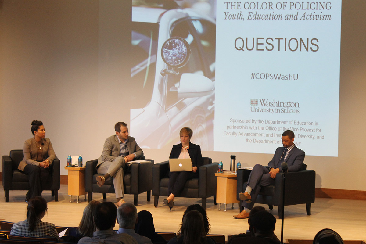 Panelists discuss educational gaps, restorative justice and the school-to-prison pipeline during the Lowenthal Color of Policing Symposium on April 19. From left: Candice Carter Oliver, CEO of Confluence Academy; Jeremy Esposito, chief academic officer for KIPP Schools; Christie Huck, executive director of City Garden Montessori Charter School; and symposium convener Odis Johnson, associate professor in Arts & Sciences. (Photo: Roshonda Ludy)