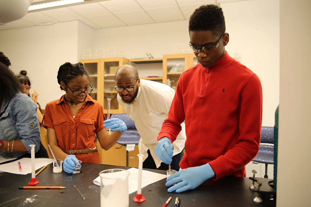 Marcus Foston (center), of the School of Engineering & Applied Science, helps students from KIPP Inspire Academy with their bioplastics experiment April 24. He hosted the group in his lab as part of the event “Researcher for a Day.” (Photo: Myra Lopez)
