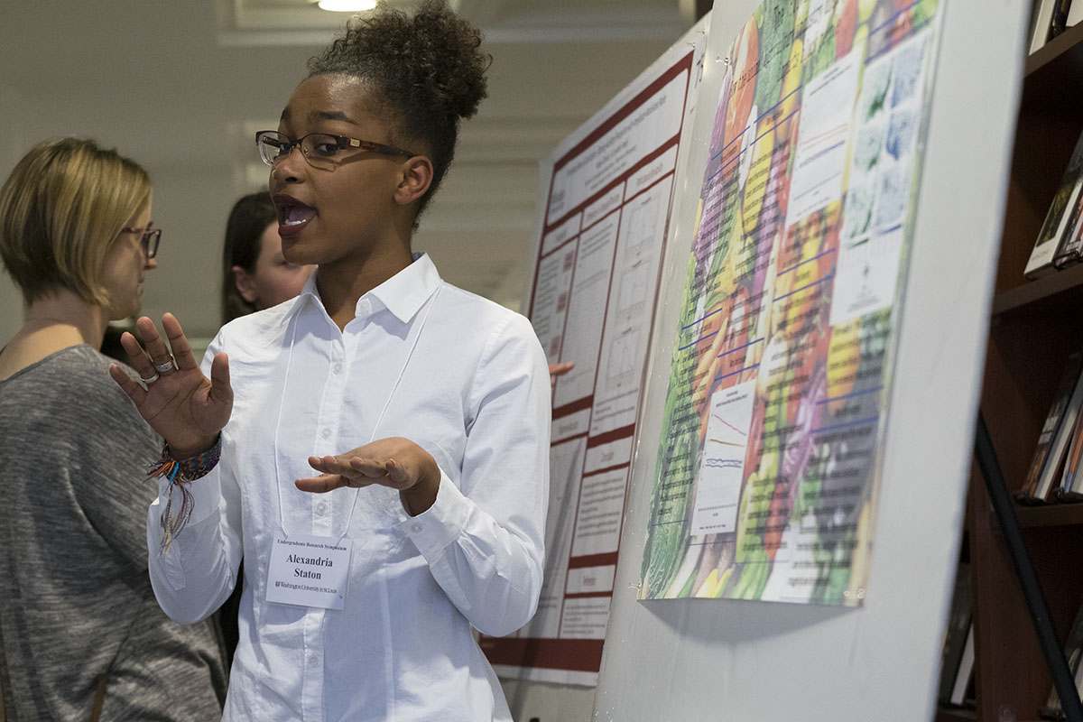 Students gathered for the Spring 2018 Undergraduate Research Symposium April 13 in the Laboratory Sciences Building and Olin Library. Here, student Alexandria Staton discusses her work, “The ‘Privilege’ of Health,” during a poster session. (Photo: Sid Hastings/Washington University)