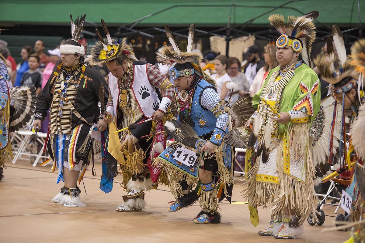 Participants perform during the annual Pow Wow, hosted by the Buder Center at the Brown School, in the Washington University Field House on April 21. (Photo: Danny Reise/Washington University)