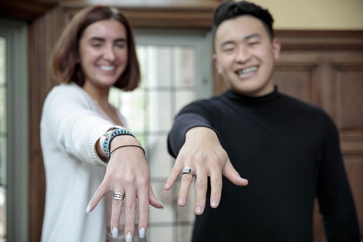 Seniors Amanda Brown and Bill Feng pose with their new class rings. Rob Wild, dean of students, led the university ring ceremony for graduating seniors April 25. (Photo: Whitney Curtis/Washington University)