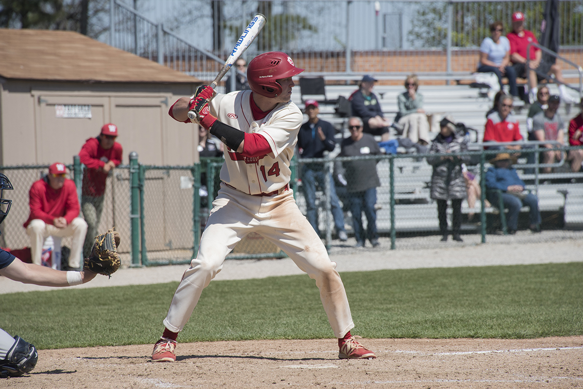 Sophomore Brian Schutter steps up to bat during the Bears’ Senior Day baseball game against Brandeis on April 28. The Bears swept a double-header against Brandeis, taking the first game 7-5 and the second 8-7. (Photo: Mary Butkus/Washington University)