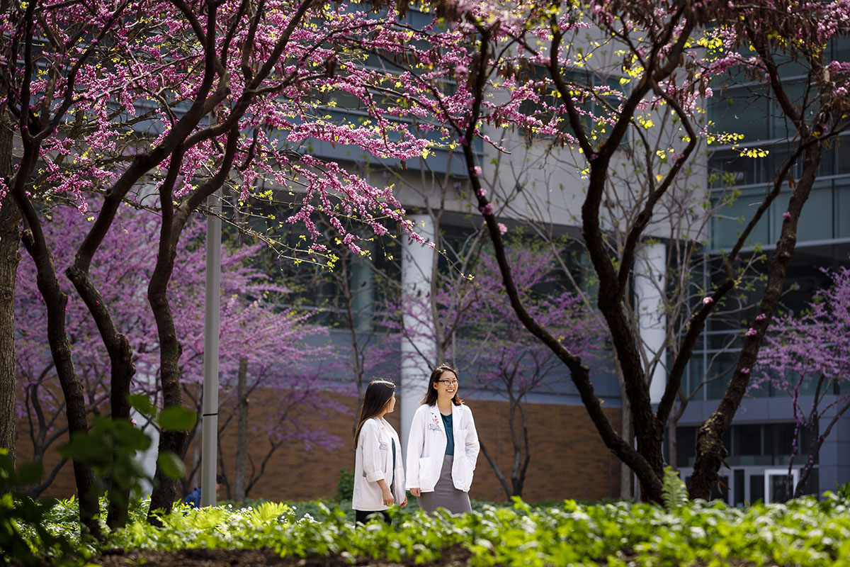 Medical students Brooke Liang and Margery Gang visit during a warm spring day May 2 in Ellen S. Clark Hope Plaza on the Medical Campus. (Photo: Matt Miller/School of Medicine)