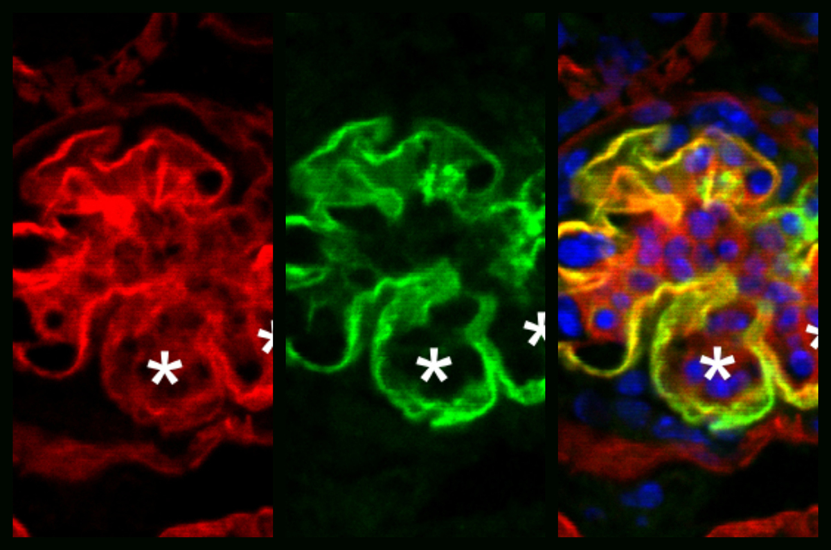 The Journal of the American Society of Nephrology chose an image from a manuscript by Meei-Hua Lin, of the School of Medicine’s Division of Nephrology, to grace the first issue of its new cover format, debuting in the May 2018 issue. The image on the far right is on the new JASN cover. Learn more about the research behind it. (Image courtesy of Meei-Hua Lin)