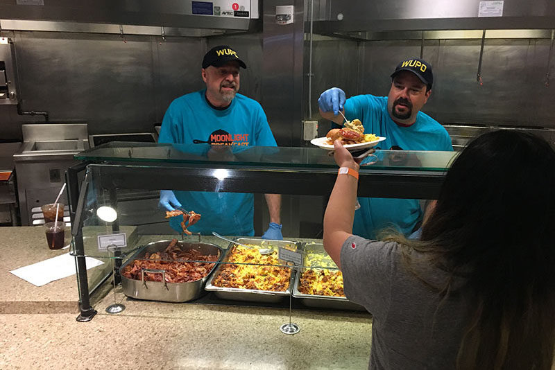 Sgt. Bob Wayne (left) and Corp. Ed Bartelme of the Washington University Police Department dish out bacon and eggs to hungry students at the Moonlight Breakfast, a favorite Reading Week tradition, on May 1. (Photo: Rob Staggenborg/Bon Appetit)