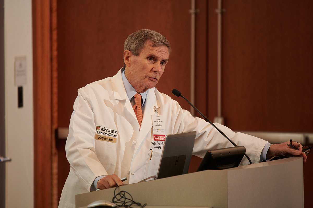 Ralph G. Dacey Jr., MD, was the honoree and keynote speaker at the 62nd annual George H. Bishop Symposium in Experimental Neurology May 24 in the Farrell Learning and Teaching Center on the Medical Campus. He was recognized for his accomplishments in cerebrovascular research and neurosurgery and his leadership. (Photo: Tim Parker/School of Medicine)