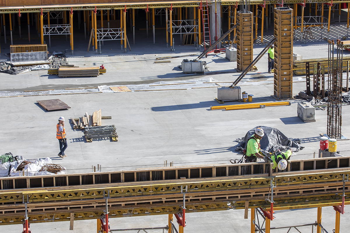 Construction continues June 1 on the “lid” of the garage being built as part of the east end project. (Photo: Joe Angeles/Washington University)