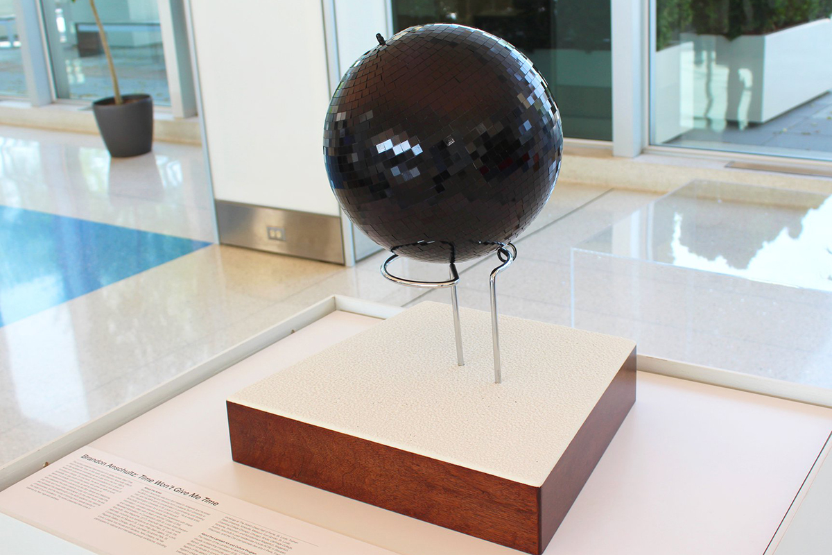 “Time Won’t Give Me Time,” an exhibition of work by Brandon Anschultz, director of the Sam Fox School’s Des Lee Gallery, is on view in the main terminal at St. Louis Lambert International Airport. Pictured is “After Party,” a black disco ball presented atop a mahogany base. Learn more on the Lambert Art and Culture program website.