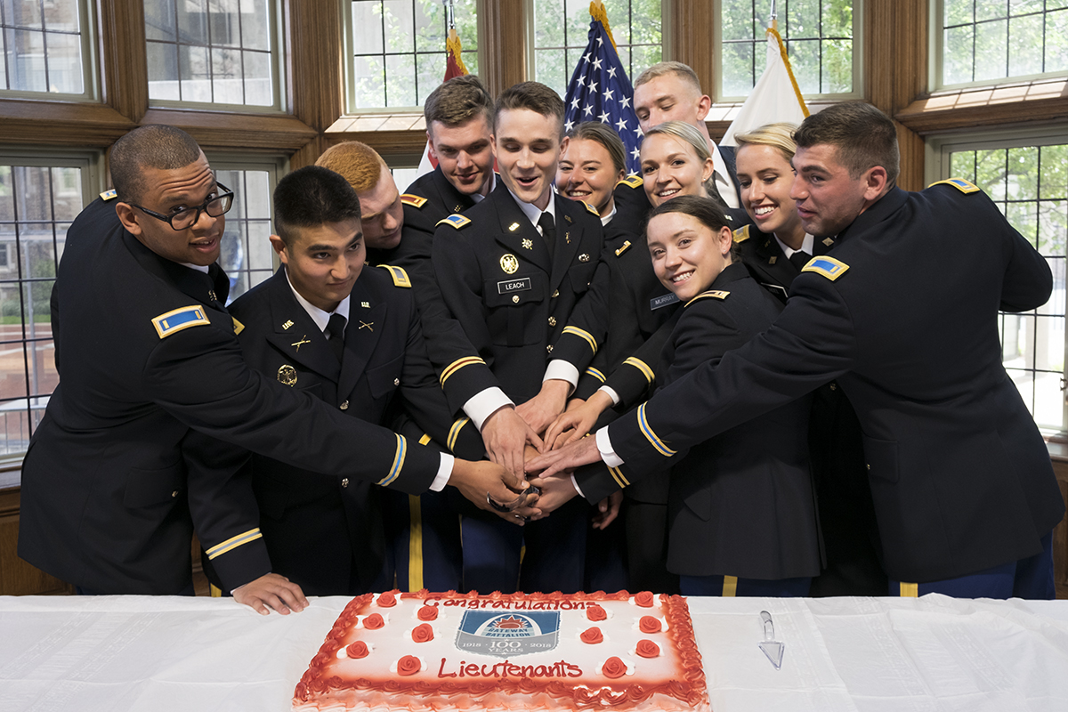 Members of the Gateway Battalion Army ROTC gathered for the unit’s 100th commissioning ceremony May 15 in Graham Chapel. Eleven new graduates from Washington University and other area universities were commissioned, and members cut a celebratory cake afterward. (Photo: Sid Hastings/Washington University)