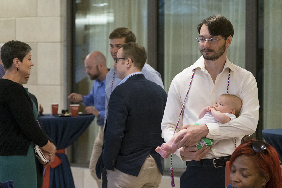 As part of end-of-year festivities, graduating students gathered for a veterans recognition ceremony May 15 in Knight Hall. Here, Devin Davenport and his 3-month-old daughter, Maeve, visit with well-wishers after the event. (Photo: Sid Hastings/Washington University)