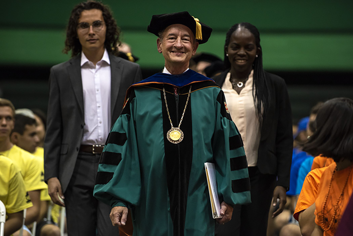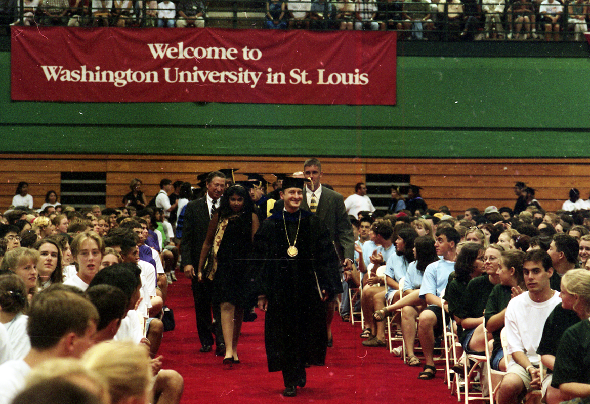 Move-in Day marked the first of many lasts for the chancellor. There will be the last Senior Dinner, last Staff Day, last Commencement. On June 1, 2019, Andrew D. Martin, Washington University alumnus and dean of the College of Literature, Science, and the Arts at the University of Michigan, will assume the role of chancellor. Martin attended Convocation, sitting in the back of the Athletic Complex. His attempt to not be a distraction was foiled when Wrighton called him to stand. Zwerling Wrighton ran over and gave him a big hug.