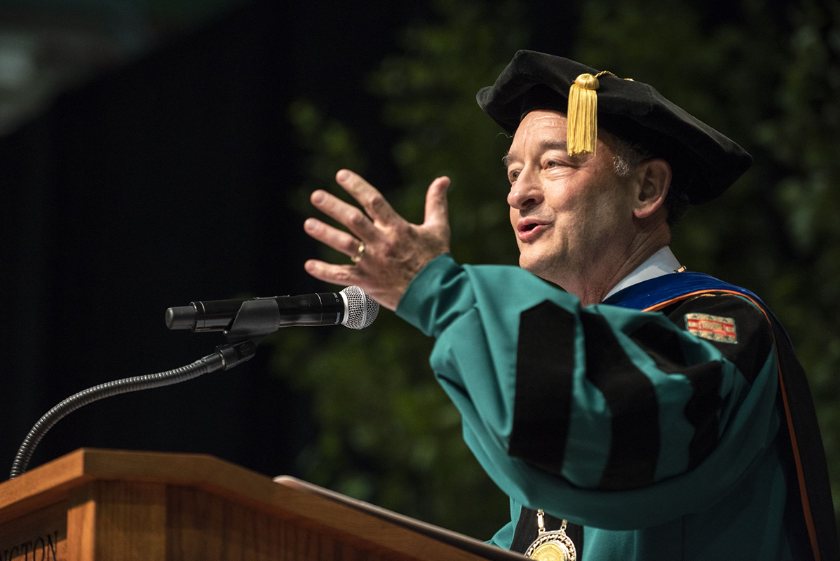 Wrighton brought that same easygoing spirit to his largely ad-libbed address. In addition to his standard advice (“No. 1: Go to class”), he gave a shout out to “secret weapon” Zwerling Wrighton, noted that the Princeton Review just named Washington University the No. 1 “best-run college in America,” urged all eligible voters to participate in the midterm elections and stated his commitment to free speech, even if Student Life, the student newspaper, is “a little hard on us.”