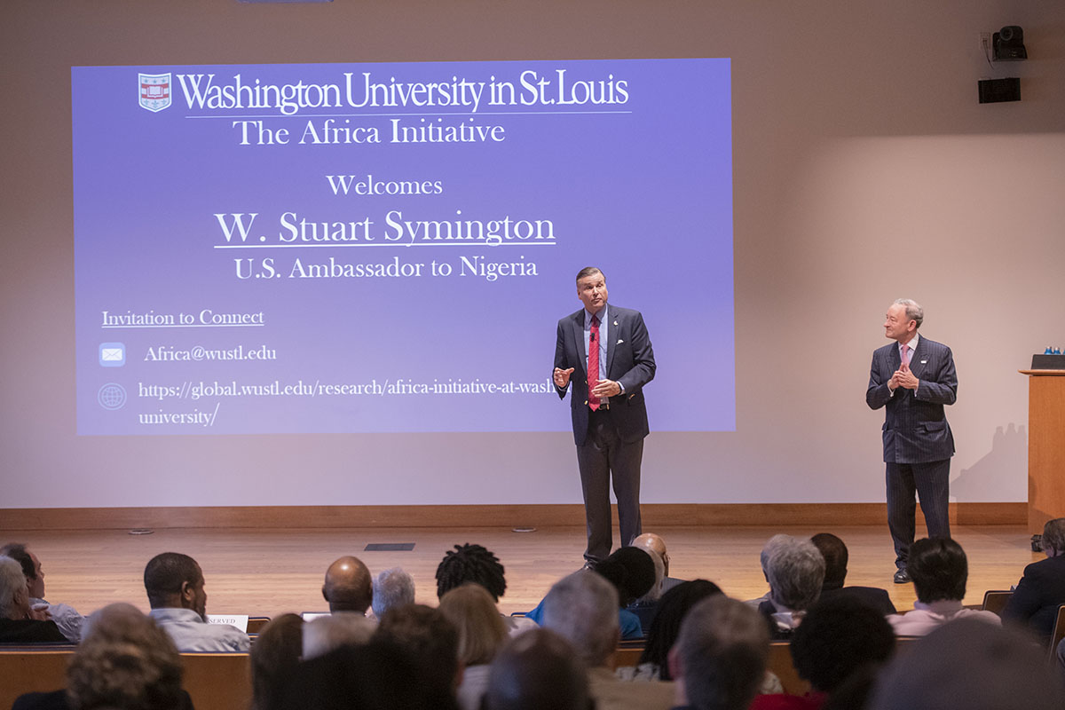 W. Stuart Symington (left), U.S. ambassador to Nigeria, addressed a crowd of campus and community members Oct. 1 in Emerson Auditorium as part of the university’s Africa initiative, established to enhance and expand programming opportunities on the African continent for teaching, research and entrepreneurship. (Photo: Mary Butkus/Washington University)