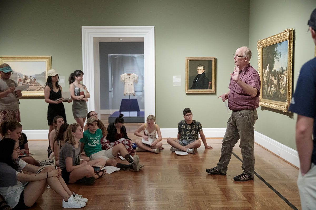 D.B. Dowd (right), professor of art in the Sam Fox School, talks to his first-year drawing class during a field trip to the nearby Saint Louis Art Museum Oct. 3. (Photo: Whitney Curtis/Washington University)