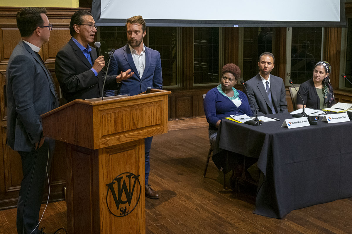 The university’s John C. Danforth Center on Religion & Politics hosted “Human Rights-Based Organizing: A Faith-Informed Response to Violence and Immigration” with Noah Bullock (third from left), executive director of Cristosal, a nongovernmental organization working to advance human rights in Central America, Oct. 8 in Umrath Hall Lounge. David Morales, also of Cristosal, speaks during the event, which also included a panel discussion with local religious leaders. (Photo: Sid Hastings/Washington University)