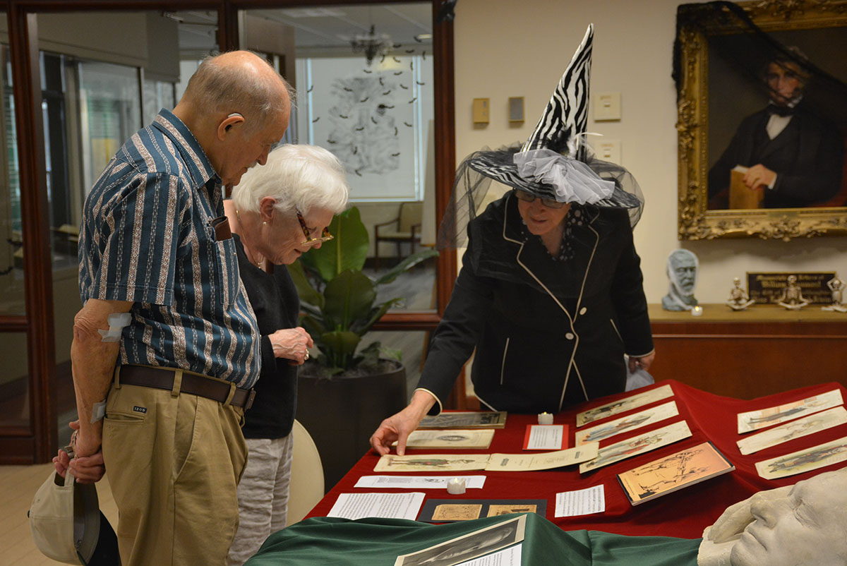 A new monthly event, First Fridays at Becker, kicked off Oct. 5, in the Becker Medical Library’s Glaser Gallery. The inaugural event was themed “Skeletons, Cadavers and Mummies, Oh My!” and featured artwork from the library’s Louis Crusius collection. Librarian Martha Riley (right) explains some of the materials. The events will be held 2 to 4 p.m. on the first Friday of the month.