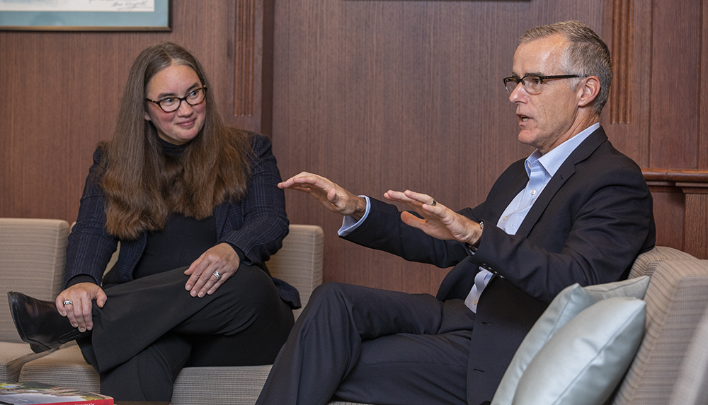 Andrew McCabe, former deputy director of the FBI and School of Law alumnus, chats with law school students in the faculty commons of Anheuser-Busch Hall Oct. 11. Rebecca Hollander-Blumoff, professor of law, facilitated the discussion. McCabe earned a JD from the School of Law in 1993. He talked about his time with the FBI and about choosing a legal career with the Justice Department.