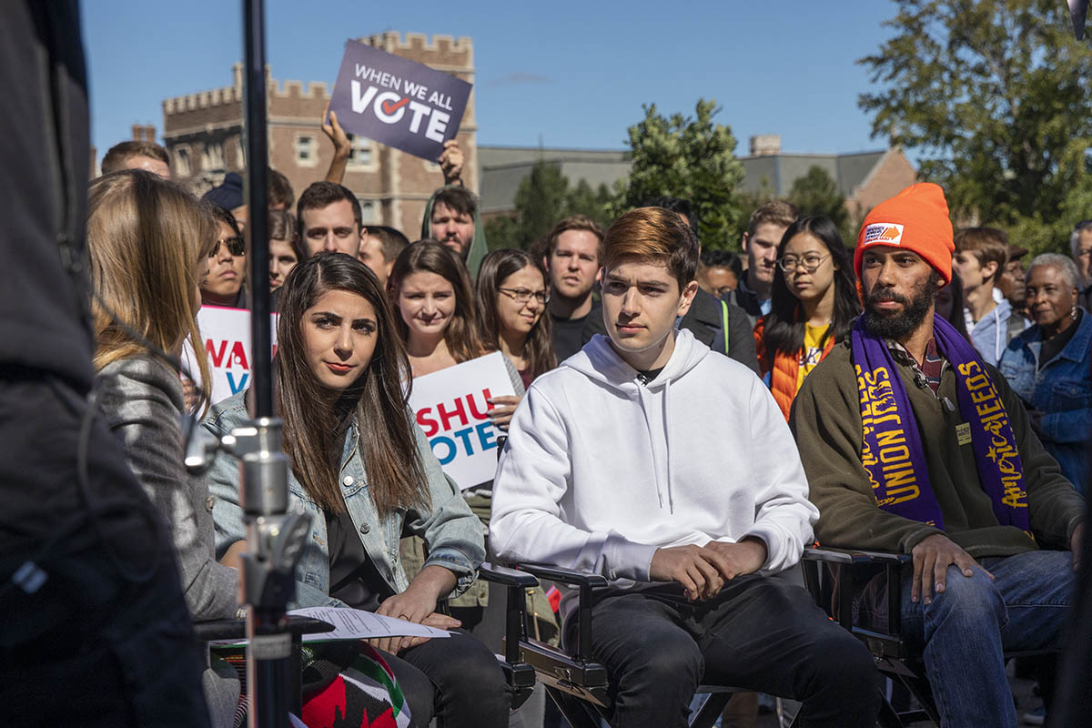 Katy Tur (left) interviews Washington University students Charlotte Nicholas, Joshua S. Kahky and Brandon R. Wilson during a live broadcast of MSNBC’s “Battleground College Tour” outside the Danforth University Center Oct. 11. Click here to view the segment. (Photo: Whitney Curtis/Washington University)