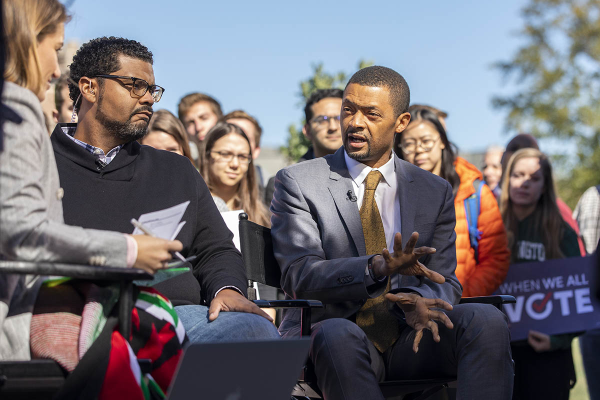 Katy Tur (left) interviews Antonio French, EMBA ’14, publisher of The NorthSider, and Odis D. Johnson, associate professor of education and of sociology, both in Arts & Sciences, at Washington University, during a live broadcast of MSNBC’s “Battleground College Tour” outside the Danforth University Center Oct. 11. Click here to view the segment. (Photo: Whitney Curtis/Washington University)