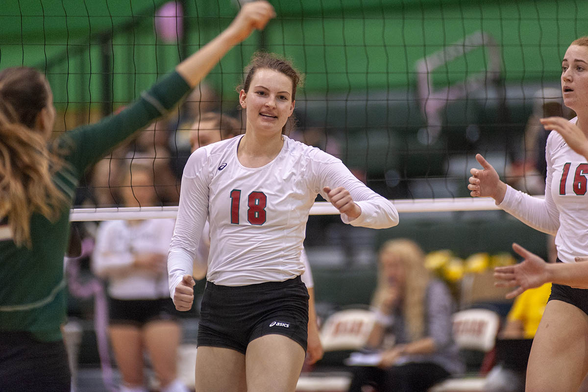 The Bears volleyball team defeated Colorado College 3-2 at the WashU Invitational Oct. 6 at the Field House. Middle hitter Julianne Malek (center) celebrates a point with her teammates during the game. (Photo: Sid Hastings/Washington University)