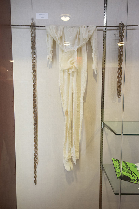 For her piece, “Vaccus,” Adcock sewed a muslin bodysuit using her own body as a model. She then dipped the body suit in hot wax over and over again.