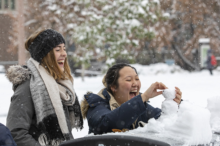 Students Giulia Neaher (left) and Phoebe Li build a snowman as snow falls Nov. 15 on the Danforth Campus. (Photo: Joe Angeles/Washington University)