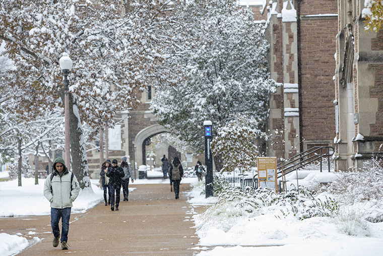 People walk through a snow-covered campus Nov. 15. (Photo: Joe Angeles/Washington University)