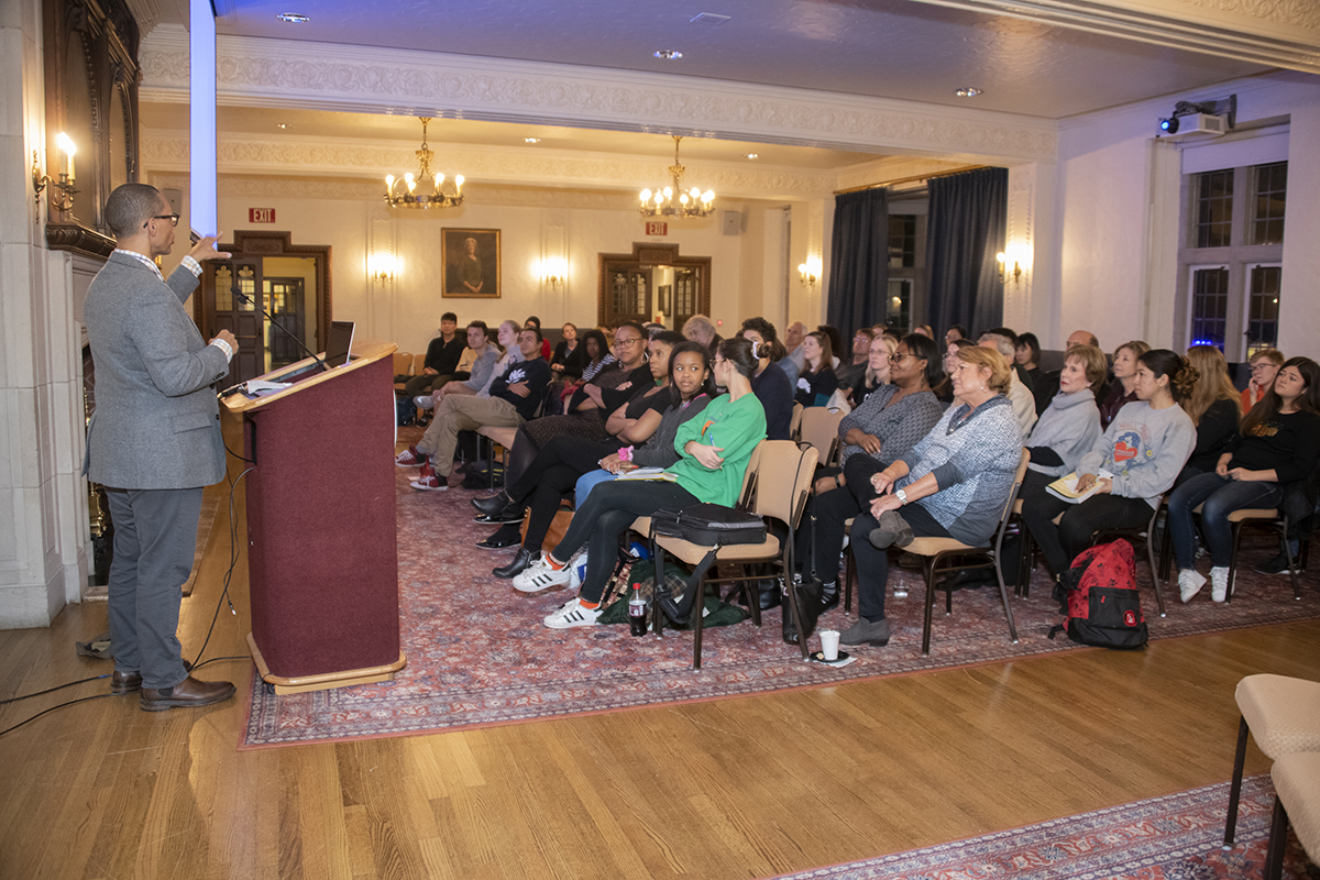 During his campus visit on Halloween, as part of the university’s Frankenstein Bicentennial celebration, author Victor LaValle met with students and gave an Assembly Series talk on “Destroyer,” his comic book which marries the Frankenstein legend with the Black Lives Matter movement. (Photo: Mary Butkus/Washington University)