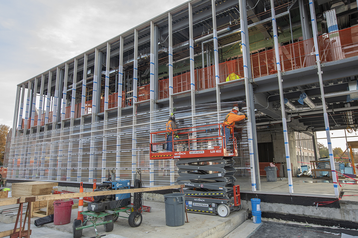 Work continues Nov. 7 at the east end construction site. Workers enclose the Schnuck Pavilion with corrugated polycarbonate sheets so interior work may continue. The glass facade will be installed later. (Photo: Joe Angeles/Washington University)