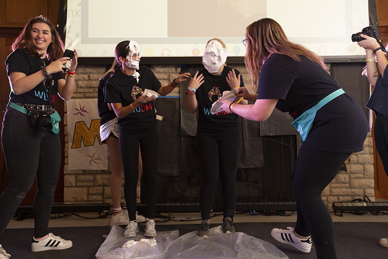 Lizzy Puyo (left) and Katy Colea suffer pies in their faces for a good cause during the annual Dance Marathon Nov. 10. (Photo: Jerry Naunheim Jr./Washington University)