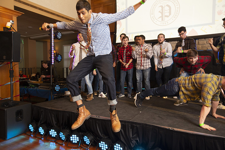 Pranav Buggana, a member of The Pikers student a cappella group, leaps from the stage during the university’s annual Dance Marathon Nov. 10 in College Hall. (Photo: Jerry Naunheim Jr./Washington University)