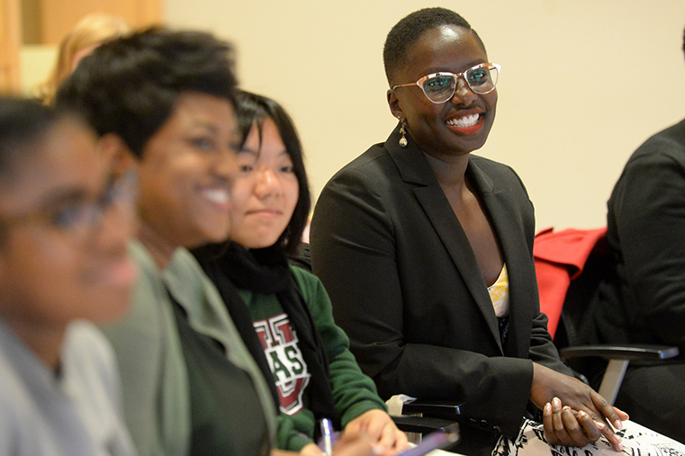 Atima Lui gave the closing keynote at the HER Summit, held Nov. 3 at College Hall and hosted by the Skandalaris Center. Lui, a 2012 alumna, is founder and CEO of NUDEST, a company that uses machine-learning software to match a person’s skin tone as a service to beauty and fashion brands. Learn how she got her entrepreneurial start at WashU. (Photo: Michael Thomas/Washington University)