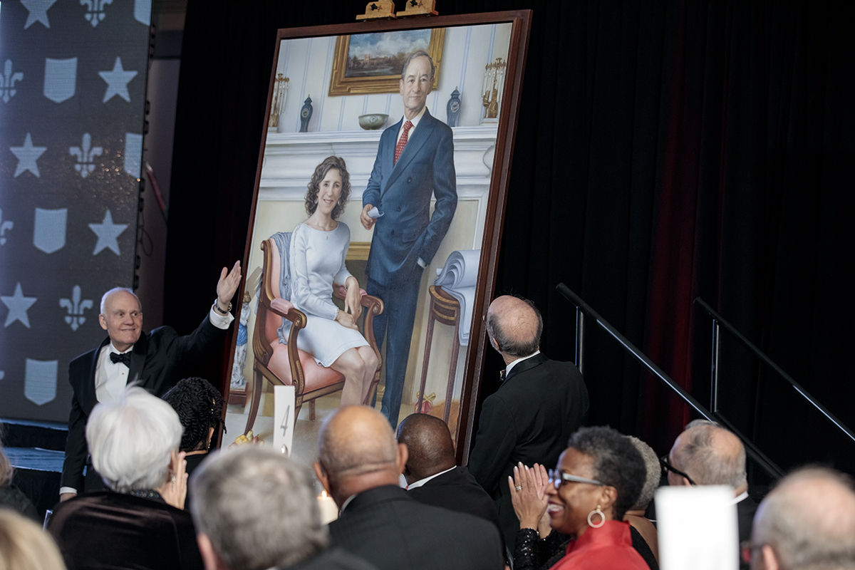 A new portrait of the Wrightons by Jamie Adams, associate professor in the Sam Fox School of Design & Visual Arts, was unveiled. The portrait will be displayed in Mark S. Wrighton Hall.