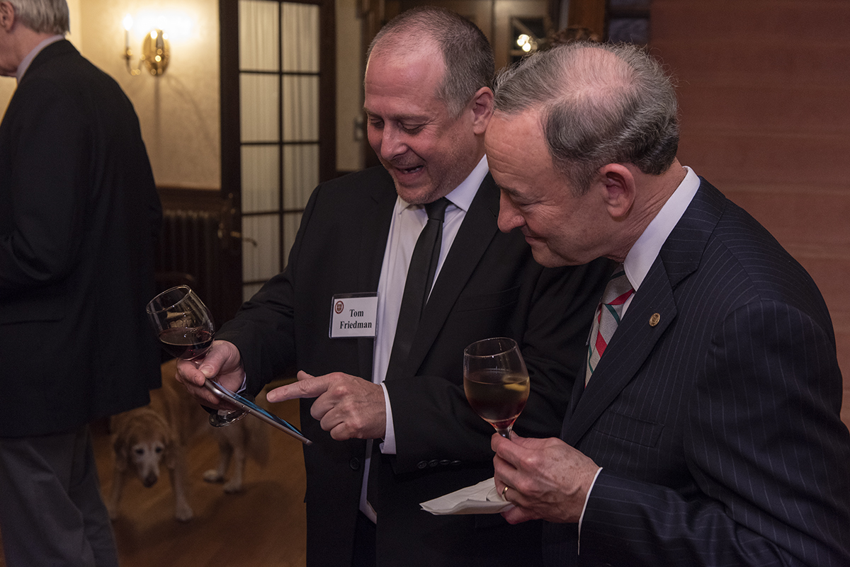 Chancellor Mark S. Wrighton (right) visits with artist and alumnus Tom Friedman during a Nov. 2 reception and dinner at the Wrightons’ home for Friedman and other honorees of the 2018 Founders’ Day celebration. (Photo: Sid Hastings/Washington University)