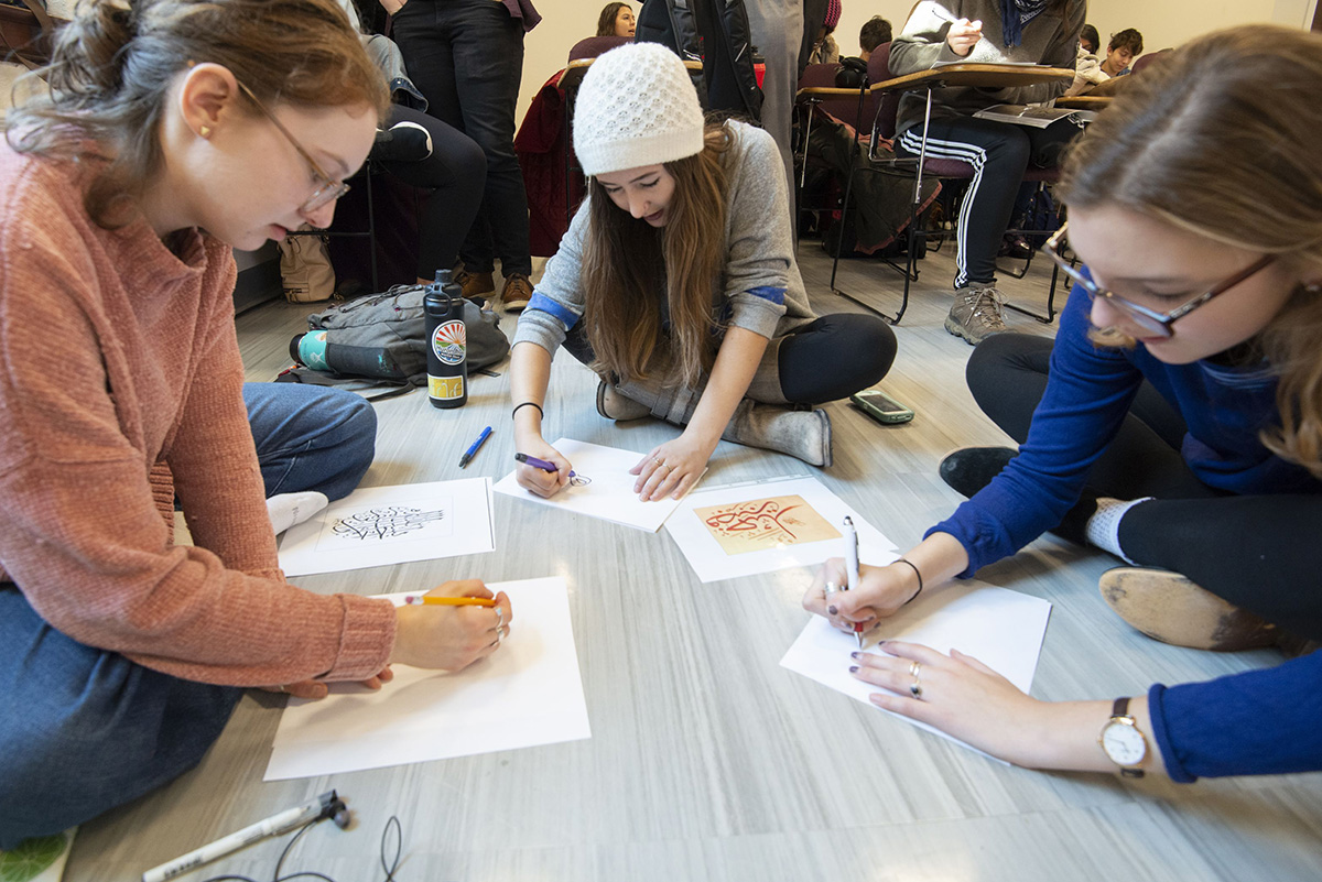 From left: Ali Zak, Mara Reed Twiss and Rivka Zimm at work during the Arabic Calligraphy Workshop on Nov. 16. The event in January Hall was sponsored by the Department of Jewish, Islamic and Near Eastern Languages and Cultures in Arts & Sciences and led by Younasse Tarbouni, senior lecturer in Arabic. (Photo: Danny Reise/Washington University)